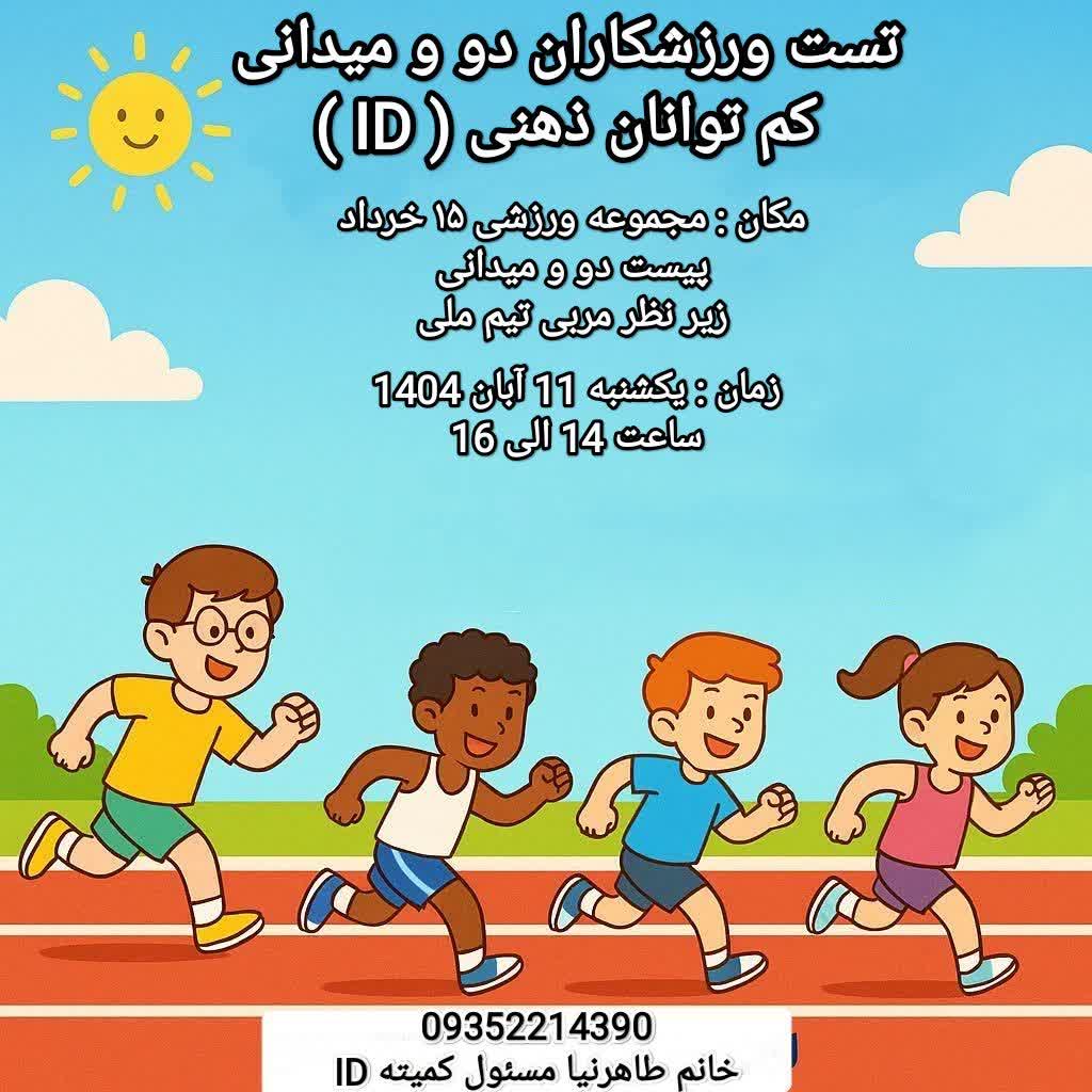 به گزارش روابط عمومی هیأت ورزشهای جانبازان و توان یابان خراسان رضوی، محمدمهدی آخوندی با اعلام این خبر گفت: بمنظور حضور ورزشکاران ID (کم توانان ذهنی) در مسابقات دوومیدانی قهرمانی کشور، کلاسبندی و تست آنان در روز یکشنبه از ساعت 14 در مجموعه ورزشی 15 خرداد برگزار می گردد.
